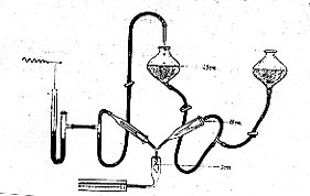 | Die Arbeitsleistung des Herzens kann jederzeit für die Zeiteinheit oder für den einzelnen Herzschlag berechnet werden, denn die geleistete Arbeit ist das Produkt der ausgeworfenen Blutmenge, des Pulsvolumens, mal der Widerstandshöhe, gegen die das Blut ausgeworfen ist. Steigert man die Höhe der Überlastung durch Heben der Ausflußröhre, so kommt man endlich so weit, daß das Herz den Widerstand nicht mehr zu überwinden vermag; die sog. absolute Kraft des Herzens (Dreser) | ![]() |
