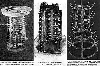 Untersuchungen ergaben folgende interessante Analogie: ein Zeitungsartikel der Süddeutschen "Das lange Jetzt, das weite Hier", besagt, daß eine Cyper-Elite der USA bestrebt ist, sämtliche Daten der Menschheit in eine Uhr einzu-speisen und zwischen der Struktur einer Kakaupresse eines Konditor-handbuchs von 1856 ergibt sich eine Parallele. Der Flaschentrock-ner M. Duchamps illustriert als weiteres Beispiel die Bauart des Festhaltens. | |||